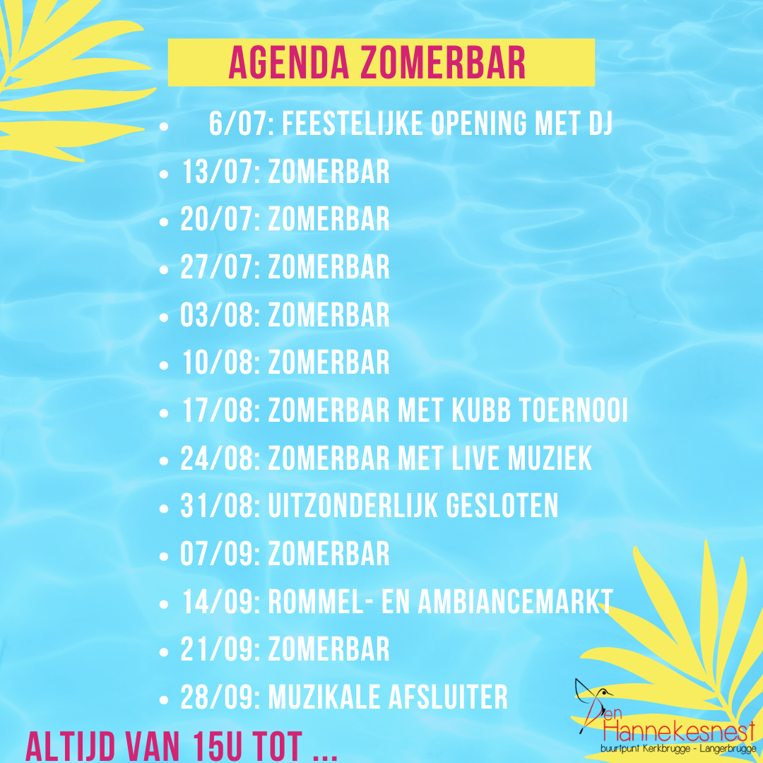 Het zomert in Langerbrugge, want momenteel kan je elke zondag terecht in de Zomerbar van Den Hannekesnest! Dit nog tot en met 28 september. Kom zeker eens op bezoek, want in de aangrenzende tuin van VBS Braambos - dat eind vorig schooljaar definitief de deuren sloot - is het lekker vertoeven zo tussen al het groen.